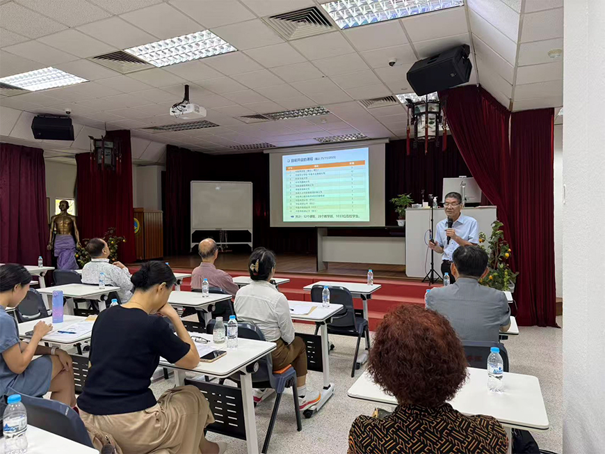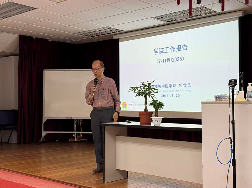 副院长何仕良就学院本学期整体工作作专题报告。在师资建设方面,学院与同济医院深化合作,新增8位具备硕博学历的临床导师。目前学院共有15名全职教师、80名兼职教师,高学历教师比例超过50%。在教学运行方面,本学期共完成12门课程、32个教学班教学任务,毕业考试及格率达93.22%,通过率提升至98%。截至2025年10月30日,学院在籍学员总数达1033人。新加坡中医学院教务处高级主任沈大庆重点汇报了教学运行与管理情况,介绍了课程安排、临床教学、注册考试组织及教学检查反馈,并对下一学期教学管理、临床实习规范及导师制度提出新要求。