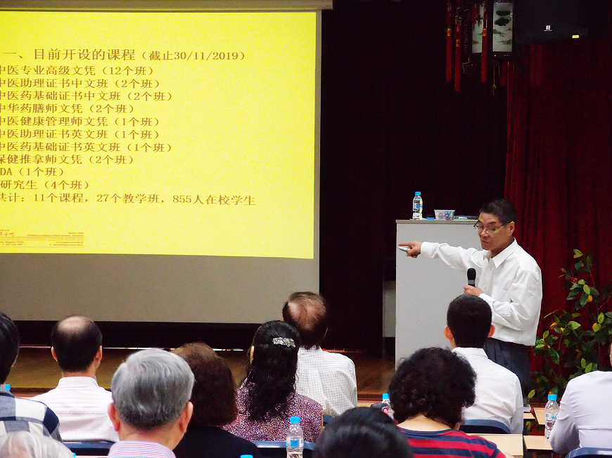 陈坤耀助理院长以《践行校训 治学严谨》为题代表学院管理层报告学院工作,他回顾了2019年学院的主要工作,特别是开展教育信托认证中期评估的准备工作,部署2020年主要工作任务,并对近期工作提出意见;沈大庆教务主任报告学院教学工作,提出下一学期要继续强化教学过程管理,调动教与学两方面的积极性,围绕注册考“十一五”到“十二五”教材的转变做好教学工作,努力培养高素质的中医药人才。临床带教交流环节,项平院长分享了试诊单书写与批改规范。