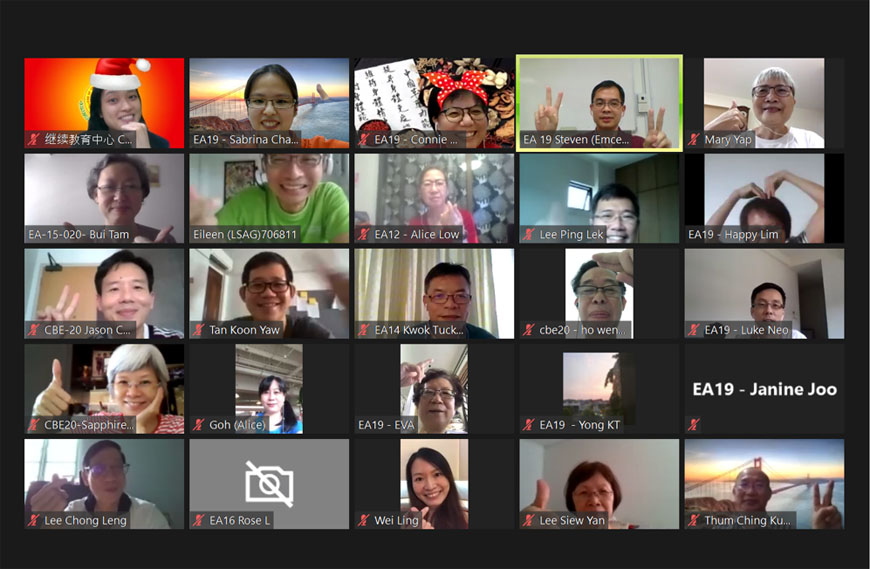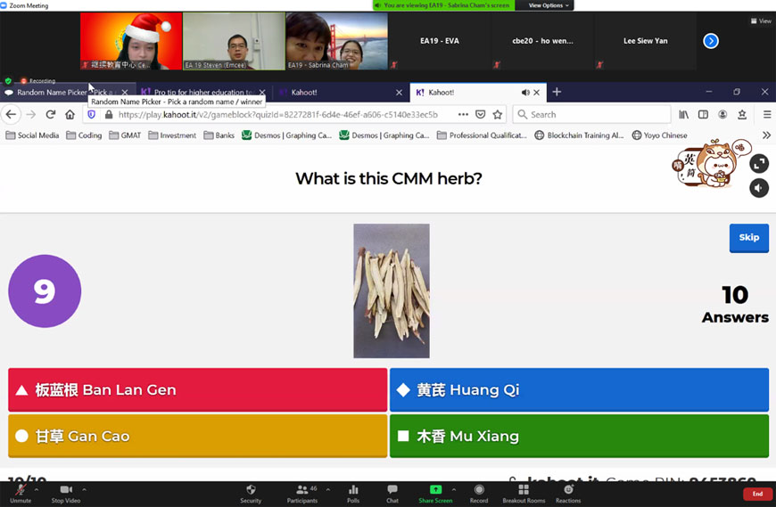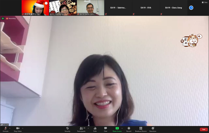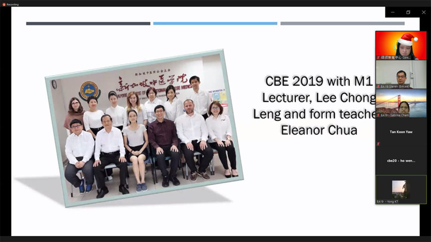 学生代表用心安排许多丰富有趣的节目,充分利用短短两个小时的线上活动。除播放该班学习旅程的视频、设计有趣线上游戏和幸运抽奖,还邀请特别嘉宾林秀娟医生分享她以西医身份对中医的看法。林医生是我院的针灸专业文凭的在籍学生。参与者不只有机会见到老同学和教师,还从林医生的分享中受到启发。今年疫情带来的重重挑战使大家更珍惜亲情与友情,线上聚会虽然让大家有机会相聚,留下美好的回忆,但大家更希望疫情快点结束,以便今后的聚会大家能真正碰面聚在一起。