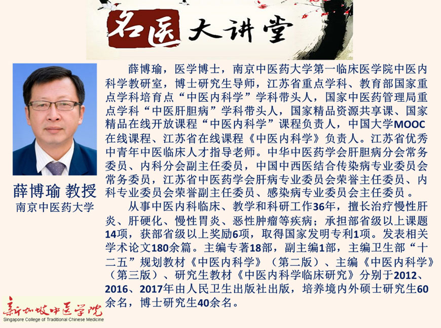 我院名医大讲堂邀请著名的中医内科肝胆病专家,南京中医药大学薛博瑜教授于11月22日及29日通过线上方式,为新加坡中医师们做了精彩的学术报告。薛教授这次的演讲的题目:①从黄疸的辨治中领略经典的魅力; ②从疫病理论谈病毒性疾病的中医诊疗策略和方法。报告中结合经典文献和现代临床研究,介绍中医学对黄疸、疫病的认识,通过临床病例分析,介绍经典方剂的临床运用。听讲的中医师都反映获益匪浅。