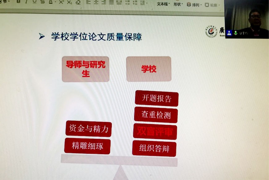 鄢院长介绍了广州中医药大学培养国外境外研究生概况,肯定了我们两校合作培养研究生方面取得的成绩。指出研究生要重视过好五关,即入学考试关、课程学习关、科研实践关、思想品德关、毕业就业关。指出导师是研究生培养的第一责任人,研究生要经常性与导师保持联系,主动汇报学习、生活、工作、思想等各方面动态。还指出,学位论文是研究生学习最主要的任务,是博士、硕士学位水平的体现,强调必须严格保障学位论文质量,严把学位授予“出口关”。鄢院长还逐一详细解答了研究生提出的涉及学位科目、开题报告、论文查重和盲审、预答辩和正式答辩等方面的问题。