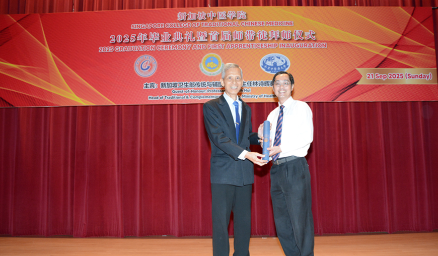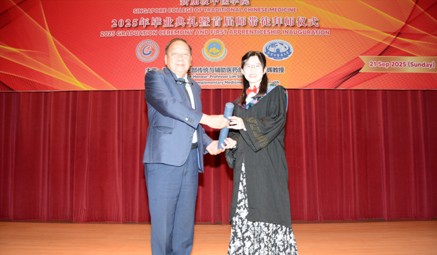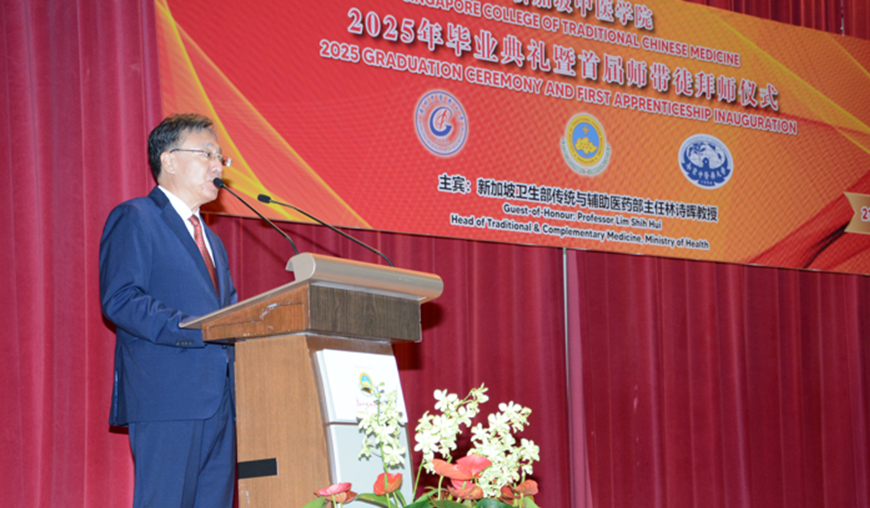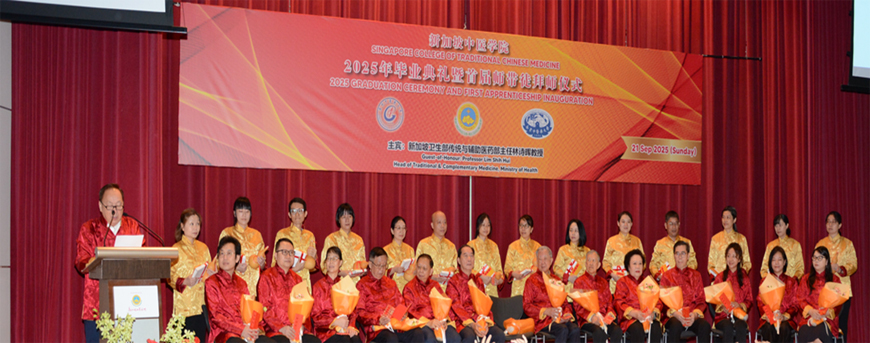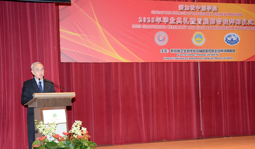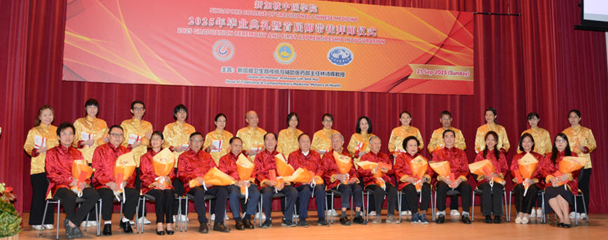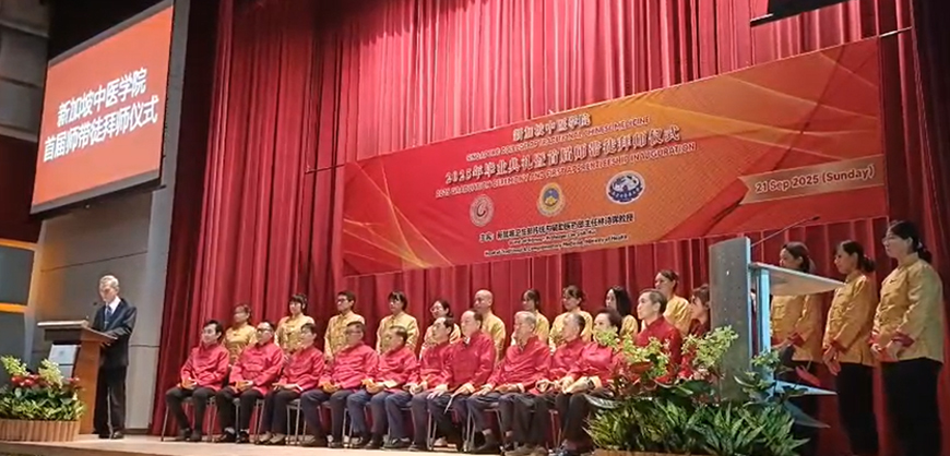 新加坡中医学院于2025年9月21日隆重举行了2025年毕业典礼暨首届师带徒仪式。新加坡卫生部传统及辅助医药主任兼中医管理委员会注册官林诗晖教授、中国驻新加坡大使馆教育处公参韩骏先生、广州中医药大学郭鸿副校长、广州中医药大学 对外交流合作部主持工作副部长陆冠儒先生、新加坡中医师公会会长,新加坡中华医院董事主席、新加坡中医研究院院长吴佳盛博士、新加坡中医师公会署理会长、新加坡中医学院董事主席,赵英杰教授、新加坡中医管理委员会委员、新加坡各中医药团体代表、中医药企业及合作单位的领导与代表、新闻媒体的朋友、新加坡中医师公会顾问、法律顾问、理事、中华医院和学院董事、老师、毕业生及家属共近400人出席。