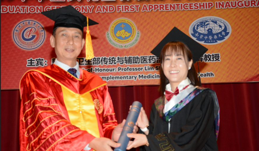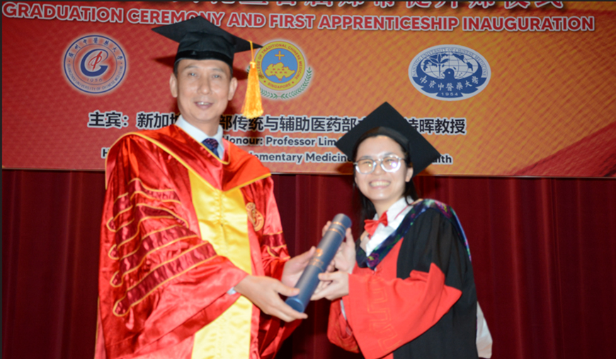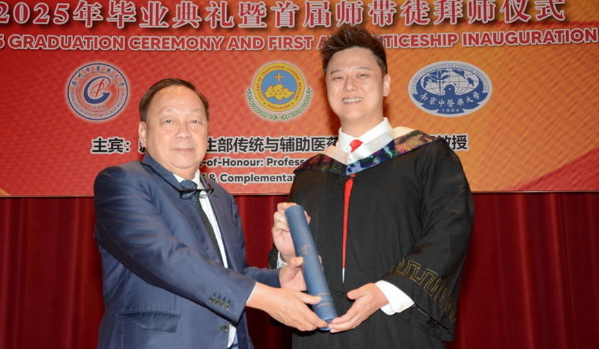 在这次2025年毕业典礼上还首次举办中医“师带徒”拜师仪式,仪式上学生通过拜师帖、献花和行礼,表达对导师的尊敬,并立下学习与传承的誓言。这次的“师带徒”拜师仪式的举行,是学院在新加坡首次推行师承的教育模式,目的是遵循“因材施教”原则,遴选具备潜力的学生,由资深中医师一对一指导,传授临床与学术经验。 鼓励学子在继承的基础上不断创新,推动中医在现代社会的应用。 随着首届“师带徒”项目的启动,被视为学院推动中医教育与临床并重的新起点。学院也重申将继续秉持“慎勇端勤”的校训,培养具备专业素养的新一代中医人才。